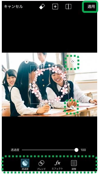 ③追加されたステッカーは、回転で向きを変えたり、大きさを変えたり、透過度を変えたり出来ます。お好みの場所に移動させたら、「適用」をタップしましょう。
