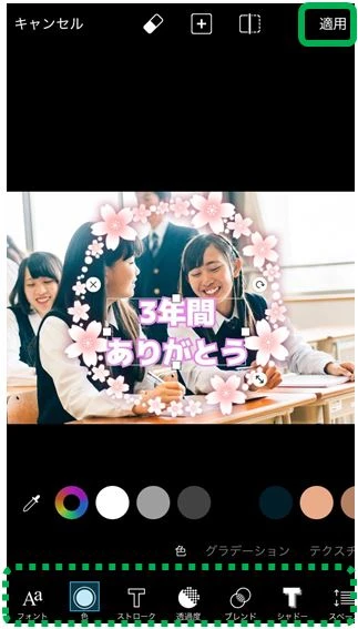 右上のチェックボタンをタップして文字を追加したら文字を修飾してみましょう!フォントや色を変えてみたり、影をつけたり少し透明にしてみたり。思い思いの文字を追加して、「適用」をタップしたら完成です!