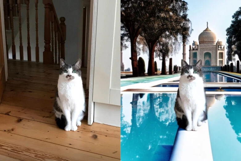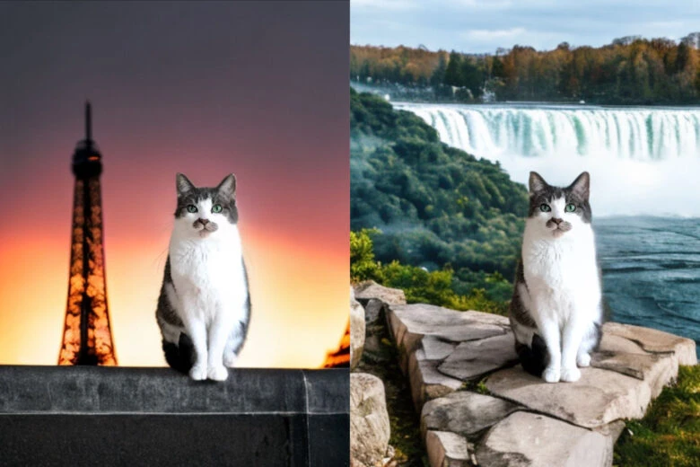 One of the most fun uses we’ve seen for AI Background so far is taking pets from the living room to all corners of the earth. @Sambambo used a mix of suggested backgrounds and prompts to send her cat, Quinn, to the Taj Mahal, Niagara Falls and Paris.