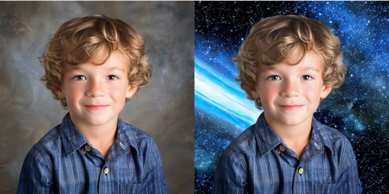 Left: Original Image; Right: AI Background applied. *note: the child above is AI generated