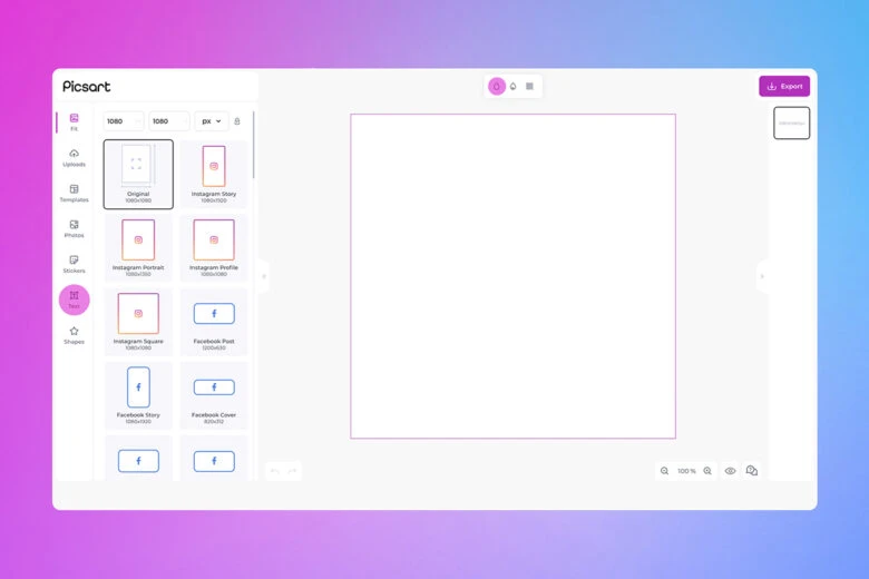 5) You can add an effect, a sticker or a shape from the Effects, Stickers, and Shapes menu sections on the right. When you’re done editing, click Export in the upper right corner to download or share your design.