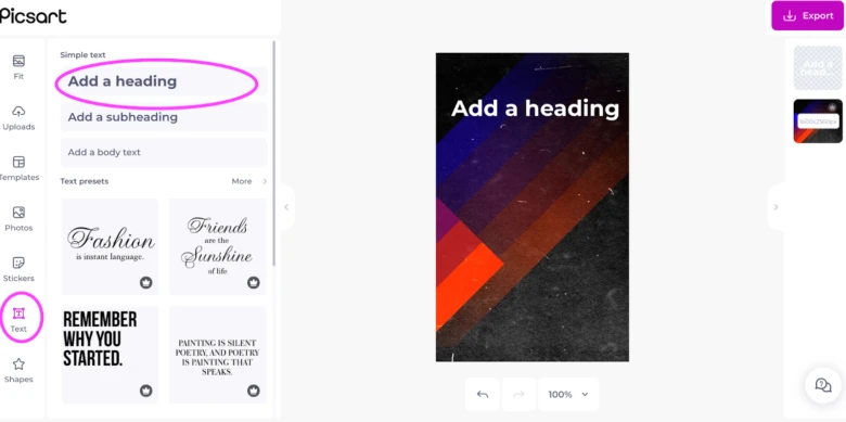 3. Click on the “Text” icon and then on “Add a heading” to incorporate the title into your design. Even though our heading font setting is big, you’ll probably have to increase it even more to fill the space. Aim for the 100 pt. size range. Add subsequent texts using the same function or the subheading one for something smaller. Don’t forget that you can always change your font style as well as the spacing between letters using the tools that appear when you click on your text box.