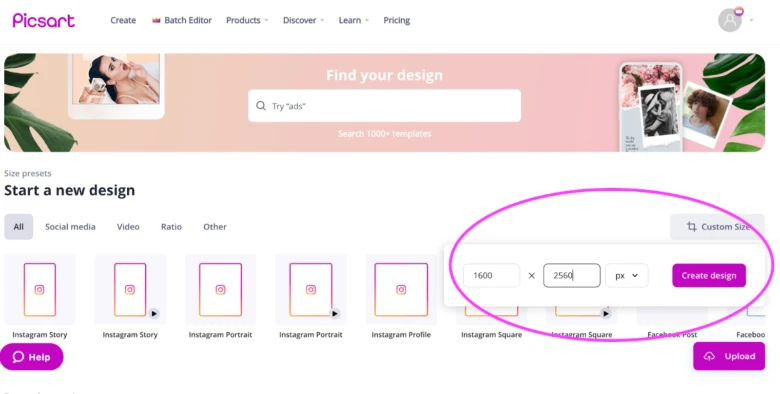 - Once you have our web application open, set your canvas size. Generally speaking, 1,600 x 2,560 pixels is a good rule of thumb for a book cover, and it’s very easy to make a canvas exactly this size. Simply click on “Custom Size” on the new design screen and enter the pixel quantities. Then, select “Create design.”