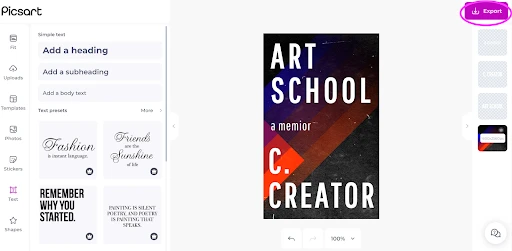 4. When you’re finished, download your creation by clicking “Export” in the upper right-hand corner. Now, you’re the expert, so transfer these skills to other designs, too, like the cover image for your podcast or ‘zine.