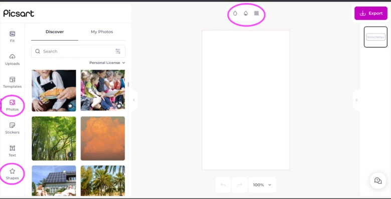 2. Start your background. You have three options: a photo, a color fill, or shapes. Let’s locate the tools that correspond to these three options. Above your canvas, you can find the toolbar with the option for a color, gradient, or texture fill. If you’re thinking about going with a graphic pattern, we highly recommend checking out the texture fill options as there are some cool ready-made graphics there. In the lateral toolbar to the left of your canvas, you’ll find both the photo and shape options.