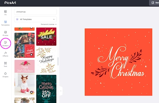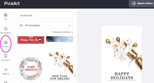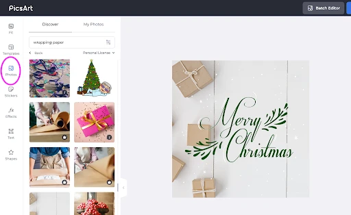 Now, we’re down to the background. This design goes with solid color, but graphics and patterns work well, too. The key is maintaining good balance. If you have a lot going on in the foreground and middleground, stick to solid colors or big graphic elements in the back. If you’re keeping things simple in the foreground, try a detailed graphic or image fill from the Picsart photo bank (circled in the image below). Plaid and wrapping paper prints are great seasonal options.