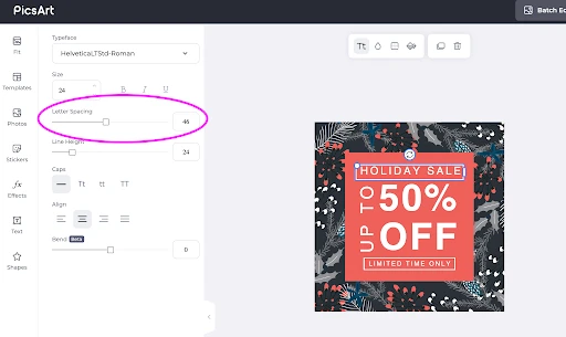 One way to make a statement is by using unexpected fonts. As we saw earlier, Christmas designs tend to use heavy scripts, so try a more laid-back approach. Dreaming of a sleek Christmas? Experiment with bold modern fonts: no-frills letters with spacing between them. You can shift the spacing on letters by clicking on your text box and using the slider in the panel to the left of your image.