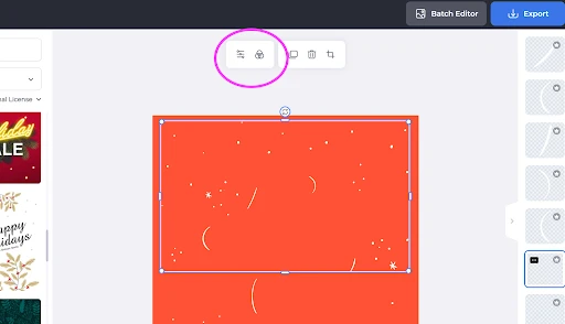 Let’s take away those foreground elements and see what we’re left with in the middleground: a smattering of snow. While it may look like someone took the time to carefully place each flake, this is actually an optical illusion. Just a few ready-made stickers create this effect, giving an instant touch of elegance to the design. If you want to bring your own flair to a sticker, click on the graphic you wish to edit and use the editing toolbar to shift hue, opacity, and more.