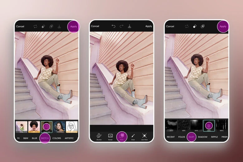 4) Scroll across and tap on Sketch to open up a variety of art effects. Use Cartoon1 for a smooth, soft cartoon aesthetic on portraits and selfies. For a slightly more gritty effect, Cartoon2 is your friend. They’re both free, easy to use, and they make your portraits look like professionally-created cartoons in seconds. Tap Apply to save the filter on your edit.