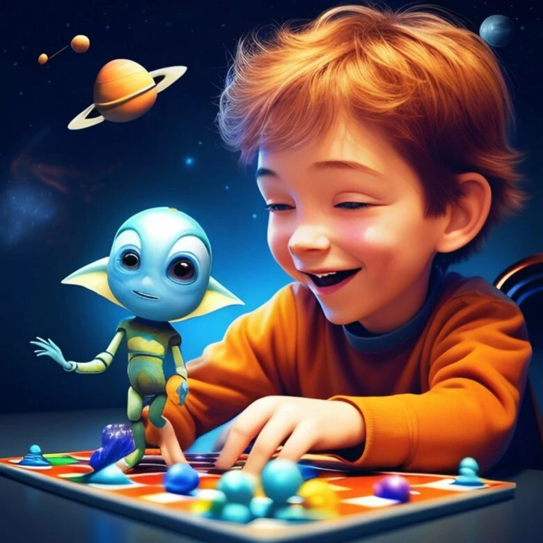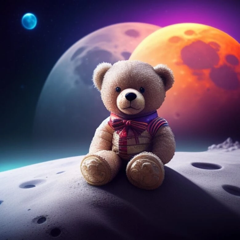 Improved Prompt: A mesmerizing cinematic shot featuring a teddy bear perched on the moon’s surface, capturing the enchanting magic of childhood dreams. High definition visual with intricate details and vibrant colors.