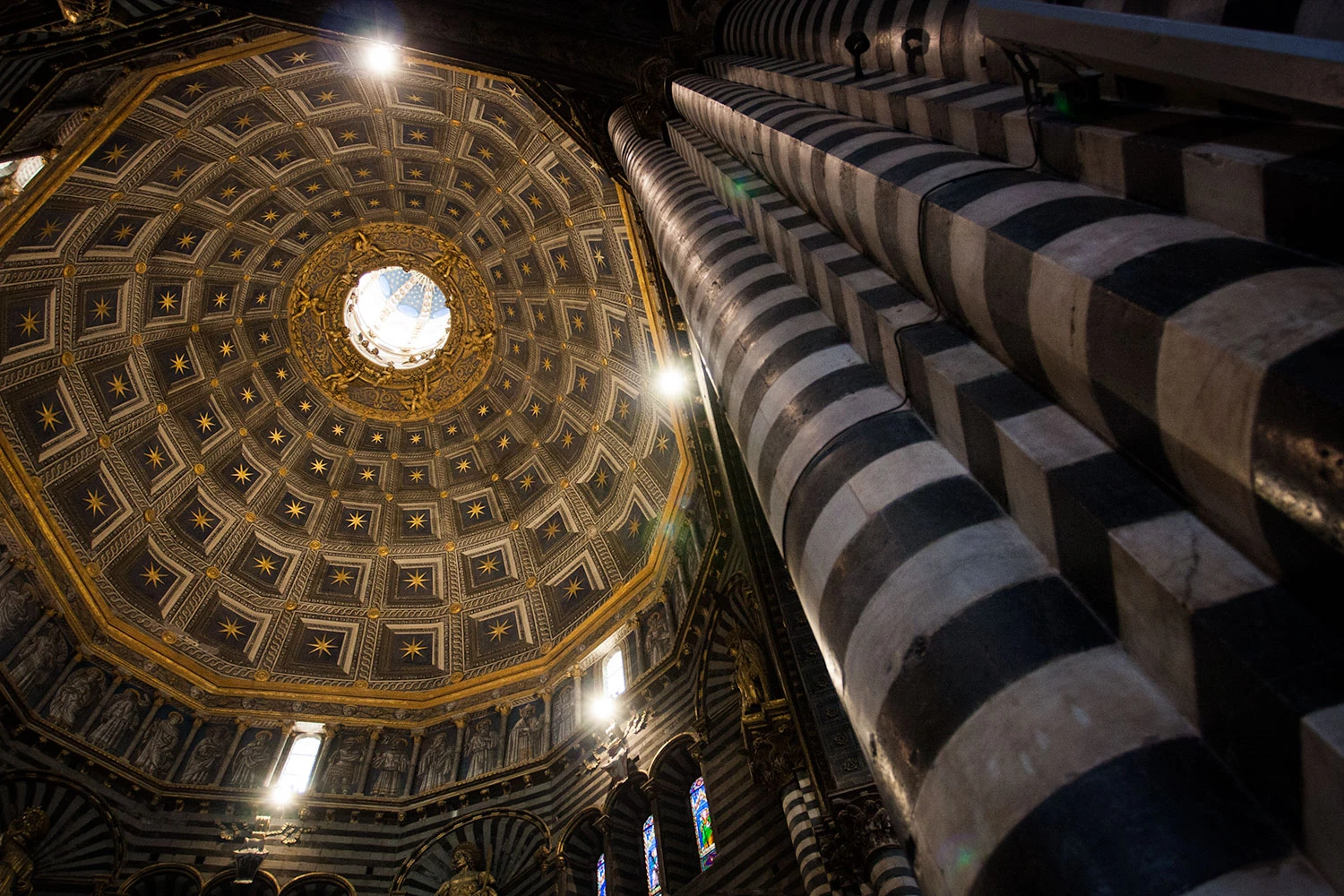 There are occasions when placing the camera on the floor will yield the best photo. This was the case at the very dimly lit cathedral in Siena, Italy. Tripods were not permitted, and a long shutter speed was necessary for a proper exposure. In order to photograph the Gothic interior, I rested the camera on the floor using my camera bag to angle it upwards. The two second timer was used to trip the shutter and record the photo. The security guards didn’t hassle me for this, and I got a sharp photo of the impressive structure.