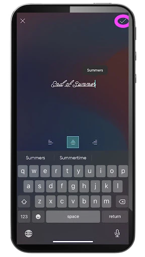 7. Add whatever text you’d like, and don’t worry about the font, size, or color for now. You’ll be able to change these stylistic aspects in the following steps. When you’re finished writing, click the check mark in the upper right-hand corner of the screen.