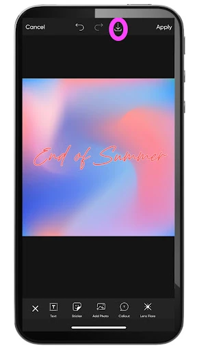 13. When you’ve finished transforming your text, you can add other necessary elements like stickers or effects. Once you’re happy with the finished product, export the image by clicking on the downward arrow above your canvas to save your custom font edit to your phone. Or, tap to the Share screen to share directly on social media or with the Picsart community.