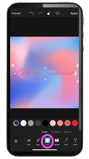 11. Back on the editing screen, you can now transform the font as needed. You can apply all the same stylistic changes to this imported font as you would have with one that was already in our library. Use your fingers to stretch out the text box until the lettering is the correct size. Then, tap on Color to change the text color as desired. If you’re satisfied, jump down to the last step to learn how to export and share your image.