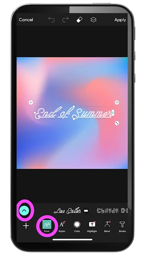 8. Tap on the Font icon in the Editor toolbar, and then click on the teal arrow in the left-hand corner under your image to pull up our library of searchable fonts.