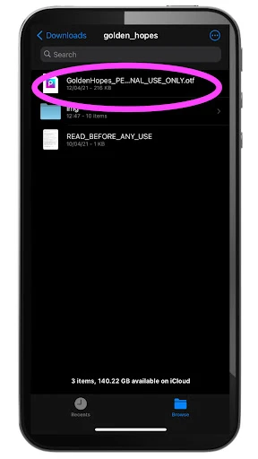 - Now, you’ll need to locate the file that you just downloaded to your phone. Keep in mind, the file’s location may vary depending on what type of phone you have. On the iPhone we used for this tutorial, the file was in the internet downloads folder. Once you locate the font, click on the file name.