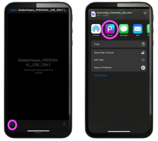 3. Click on the export icon at the bottom of the screen. A quick note: You may find this icon or function in a different place if you use an operating system that varies from the iPhone we used for this tutorial. Next, click on the Picsart icon to launch the application. Your font should now be available for use within the program, and we’ll show you exactly where to find it in the next few steps.