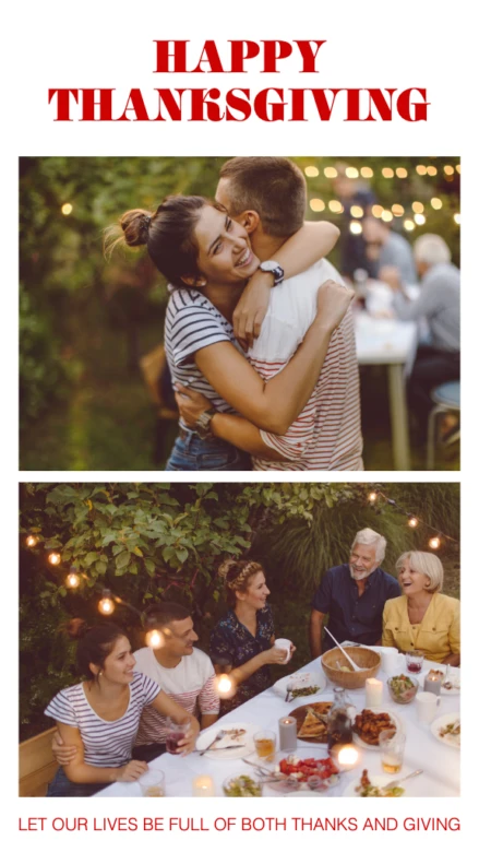 Join in the community spirit this Thanksgiving by posting an Instagram story that shares the joy of the season. You can personalize this template with images of your own team or business and add a note to show gratitude for your customers.