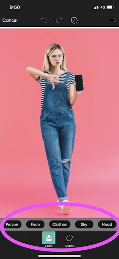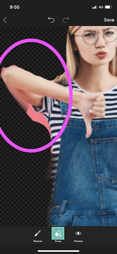 7. Finally, if you want some assistance in cutting out your image, let our app do the work. Scroll back up to step 4. Instead of using your finger to trace, select from options like “person” and “face” from the menu at the bottom of the screen. The app will guess the space you’re trying to cut out and you can later refine it by hand. If the app erases too much, use the “Restore” function. If the app leaves too much of the background in, use the “Erase” function.