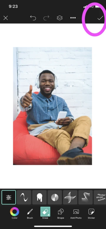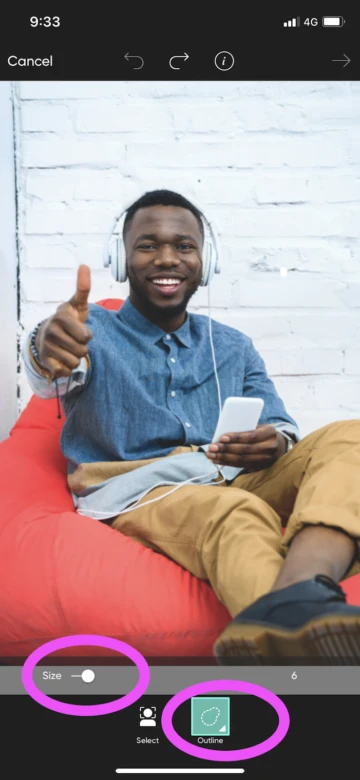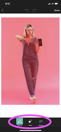 5. After, click the arrow in the top right-hand corner to move to the next screen. Here, you’ll be able to see your selection and refine it by “brushing in” any missed areas using your finger. You can also do this in “Preview” mode so that you have a better idea of the final result before clicking “Save” in the top right-hand corner of the screen.