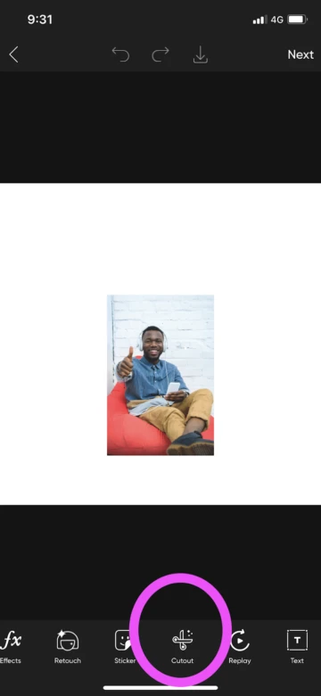 3. Once you have your image on your canvas, click the little check box in the upper right-hand corner to move on to the next step. You’ll have the option to edit or save your photo, and since we’re going to cut it out, choose to edit. Then, click on the “Cut Out” icon from the bar of options at the bottom of the screen. You may need to scroll to the right a bit to find it.