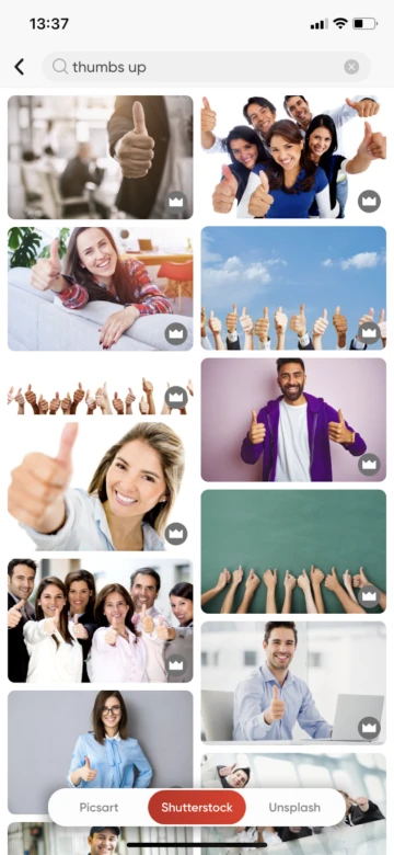 2. Next, import an image or choose one from our library by selecting “Add Photo” from the bottom of the screen. This should bring up all of the images on your phone. If you aren’t seeing them, make sure the app has access to your photos; you can fix this in your phone’s settings. If you want to use a stock image, select “Free Images” at the top of the screen and search for one that fits your vision. If you’re not sure where to start, think of what kind of emotions you often communicate in chats–approval, support, laughter, etc.–and find a picture of yourself or someone else making a gesture that shows this emotion.