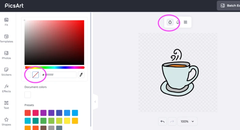 3. Remove the default white canvas background by highlighting this part of your design, going into the color selector, and clicking on the red slash under the hue slider. Your background will turn to a checkered gray pattern, signifying that it’s invisible.