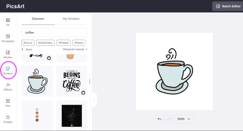 Sometimes you find exactly what you’re looking for. Before starting your own design, check out the stickers Picsart already has available. We recommend doing this on the desktop application when possible because you can export your sticker easily as a PNG file (which places your image on an invisible background).