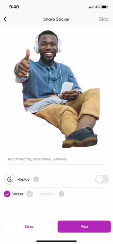 6. Once you’ve finished editing and saving your work, click “Next” in the top right-hand corner of the screen. Then, you’ll be able to choose whether to post or save your finished sticker. If you choose “Save” you can either upload your photo to your private Picsart storage or download the photo to your phone for use in your Whatsapp chats.
