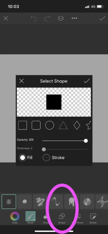 2. Then, add a shape to your canvas and change the color, size, and fill using the tools on the bottom bar and the resizing pulls on the shape itself.
