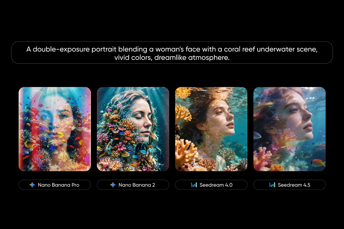 Abstract/artistic – “A double-exposure portrait blending a woman’s face with a coral reef underwater scene, vivid colors, dreamlike atmosphere.”