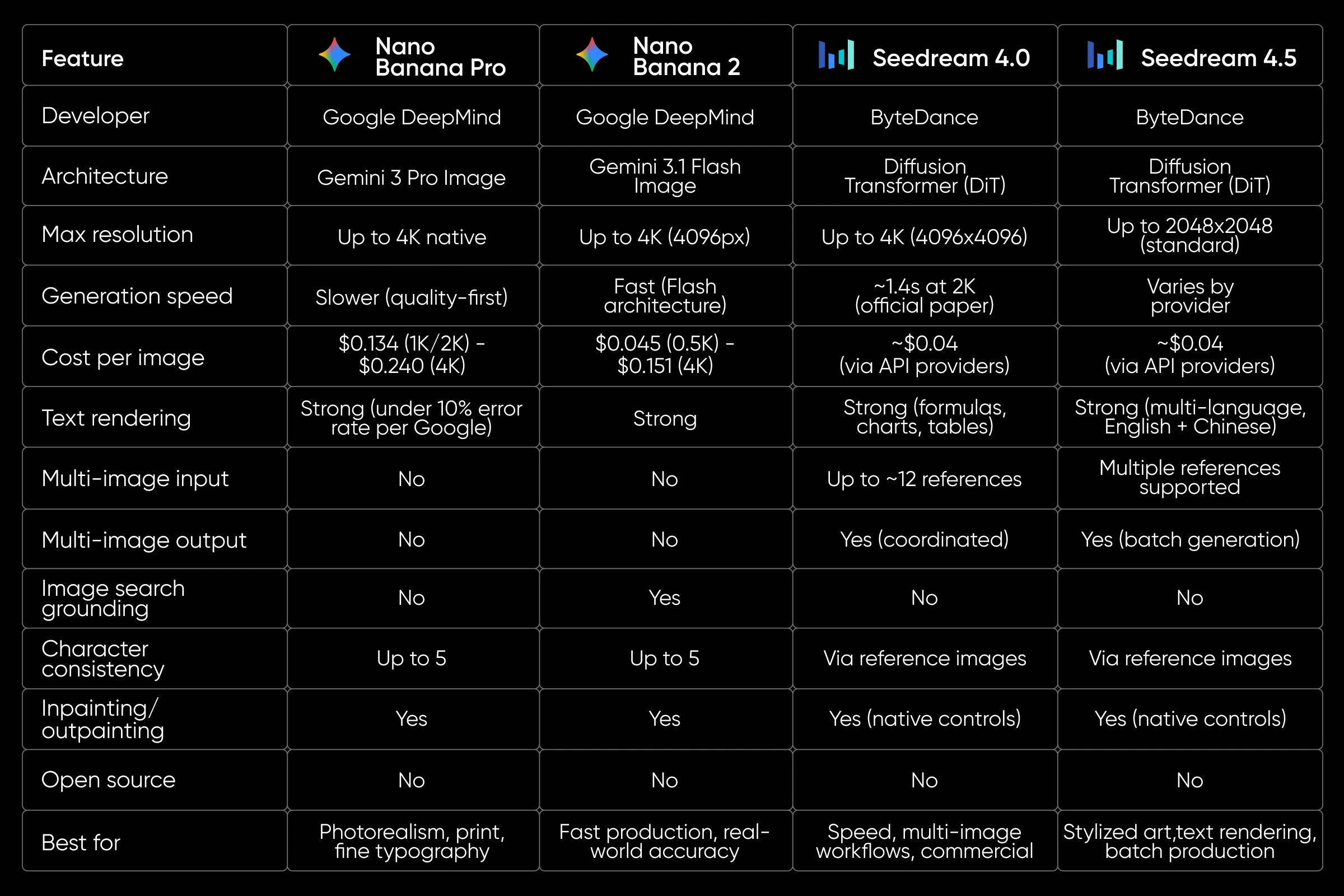 Here’s how the Nano Banana and Seedream model families compare across every key metric.
