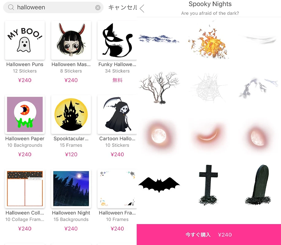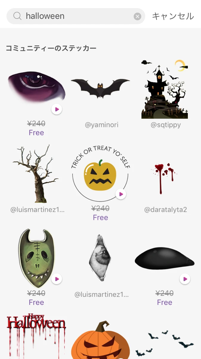 ちなみに、2.で検索して出てきた多くのステッカーが、なんと無料で使い放題!今回は、血だらけの手ひっかき傷「Halloween」のロゴなどを使ってみました。