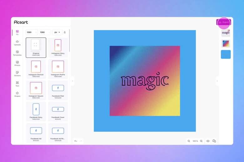 5) When you’ve made all the adjustments and tweaks required, click on Export to save or post your design.