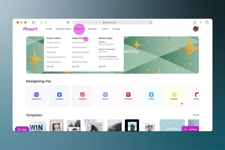 1. Open the Picsart desktop editor, click on Products and scroll down to Video Editor to start.