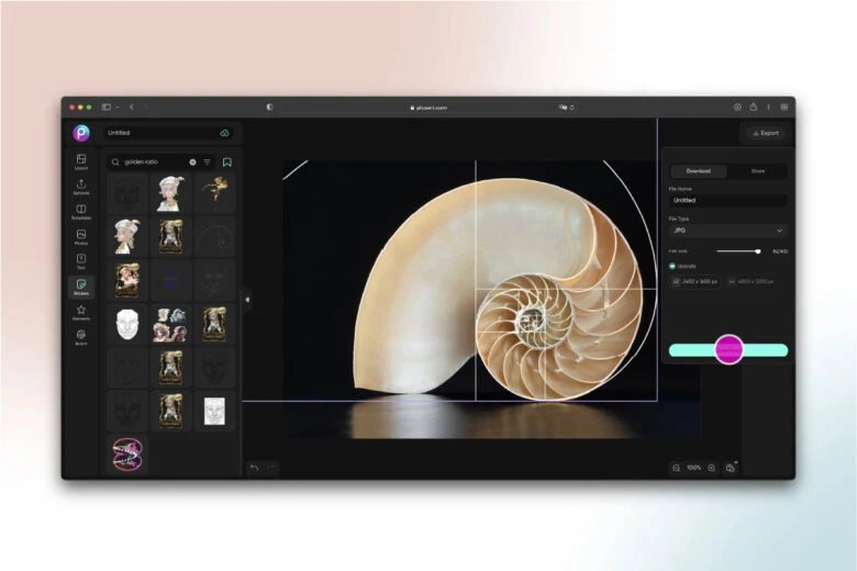 3. No painel esquerdo, clique na ferramenta Stickers, procure por ‘golden ratio’ e aplique o adesivo na sua imagem. Observe o posicionamento e lembre-se do que você aprendeu sobre posicionamento para espaço positivo e negativo nos exemplos de proporção áurea mencionados anteriormente.
