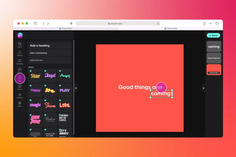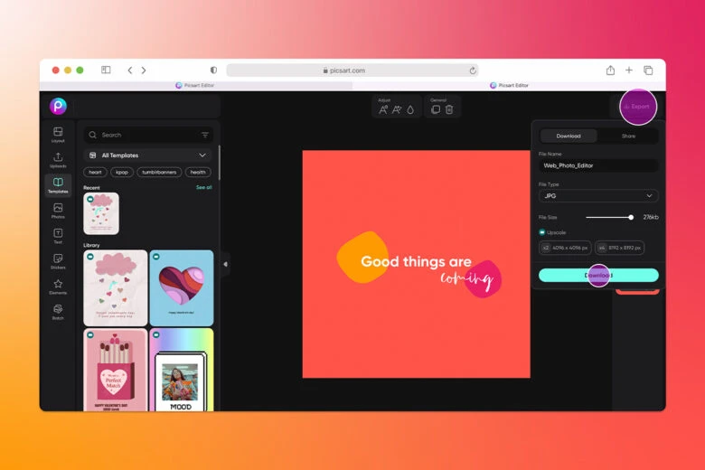 3) When you’re done making adjustments to your design, click Export in the upper right corner to download your work or share it online.