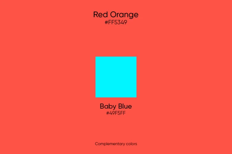To create a complementary color scheme, you should combine red orange with the opposite shade on the color scheme, Baby Blue, with the hex code #49F5FF (not to be confused with Sky Blue). These two tints clash and cancel each other out, which makes for a real feast for the eyes.