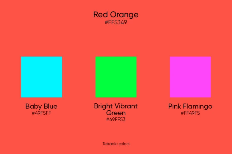 A tetradic color scheme is made up of two complements crossing the color wheel. In the case of red orange and its complement Baby Blue (#49F5FF), the other complementary pair is Bright Vibrant Green (#49FF53) and Pink Flamingo (#FF49F5; visually close to magenta).