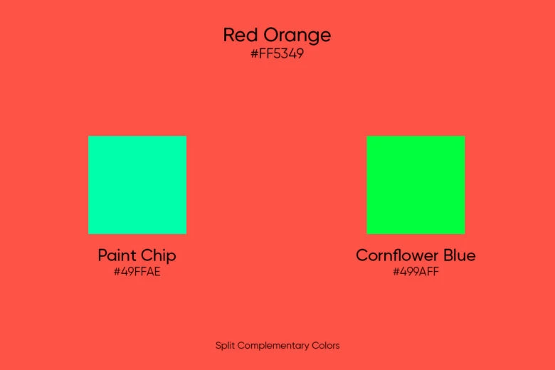 At times complementary color schemes seem too loud, so a designer, looking for something more balanced, may turn to split complementary palettes. A split complement is when instead of the color directly in front of red orange on the color wheel, we take the colors right next to the complement, in this case Paint Chip (#49FFAE) and Cornflower Blue (#499AFF).