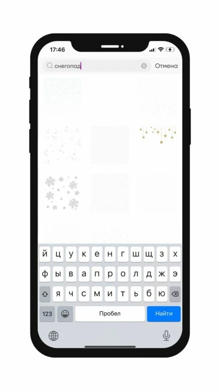 3. В разделе стикеры печатаем “снег/снегопад/снежинки” и выбираем подходящий вариант!