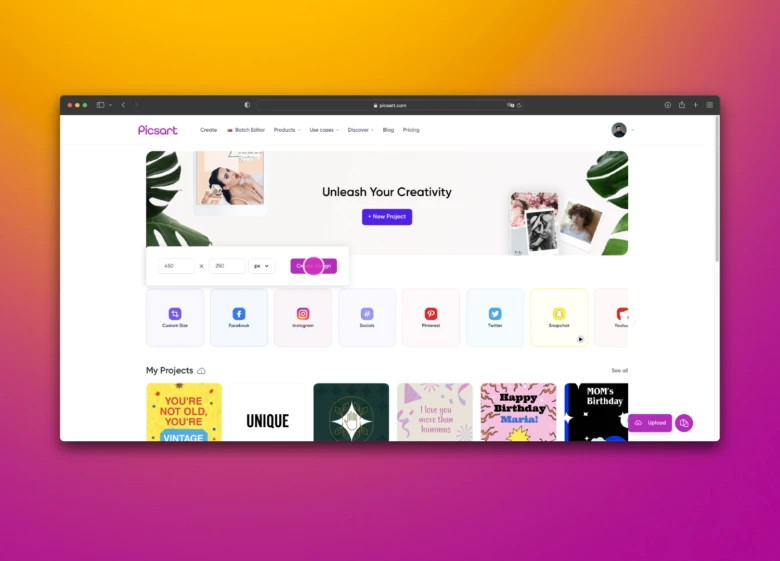 1. Open the Picsart web application. Under Designing For choose Custom Size. In the pop-up fields, enter the dimensions for the height and width of the type of Shopify picture size you’re designing for. Reference the information we provided above for a helping hand.