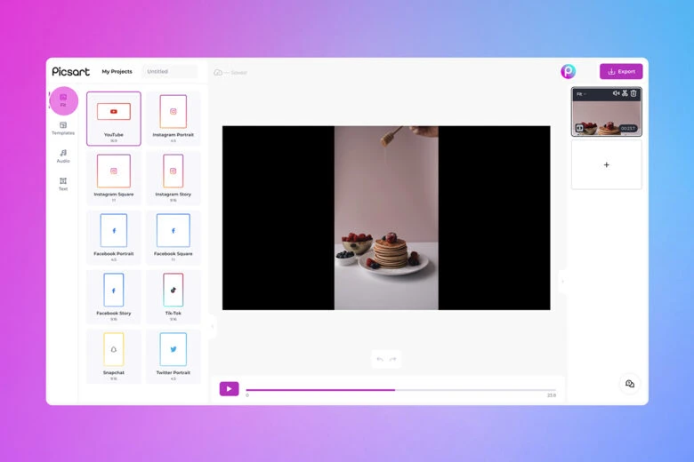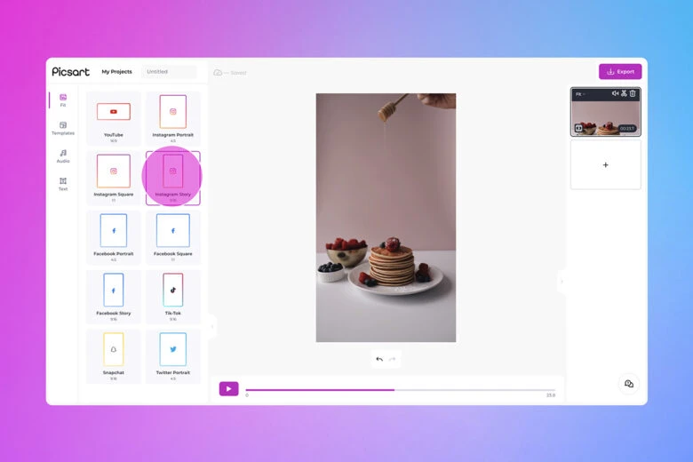 Step 3) Choose a Template from the menu in the left sidebar. You can select templates made for specific social media channels to ensure that your video will look its best for your chosen platform. You can also use the Audio and Text tools to further customize your video.