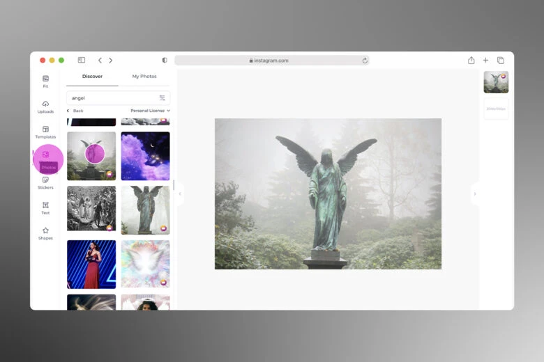 2. Select the size of your canvas out of the size presets or create a custom one or alternatively, you can click Upload to use one of your own photos.