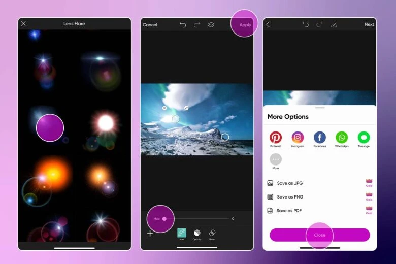4. Browse the options available and preview them on your image. 5. Once you’ve picked a filter, you can long-press or double-click on it to edit the opacity or adjust the blend mode. 6. You can add further edits and tweaks here, such as adding a Lens Flare.