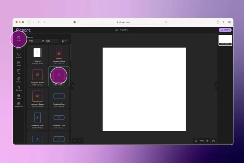 2. Click on the Layout icon and select your preferred canvas size.