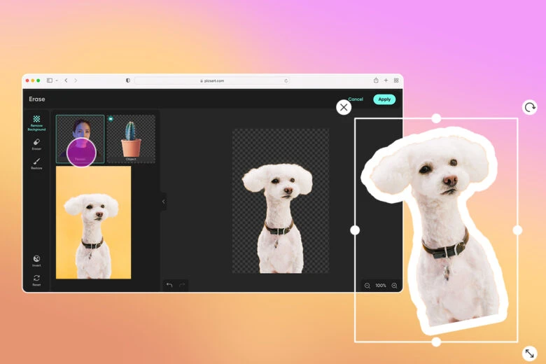 To make your own stickers, open the Picsart Sticker Maker. Then, upload a picture, and let AI automatically remove the background of your image. Your new sticker will be saved in PNG format on a transparent background so you can add it to pictures, send text messages, or create trendy designs with your pet.