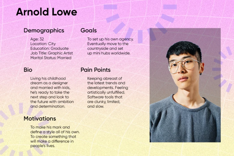 A 50-year-old man is not going to use a product the same way a teenage girl will. So, when creating user personas, it’s important to assign demographics and organize user persona templates that way. Consider including the following elements: