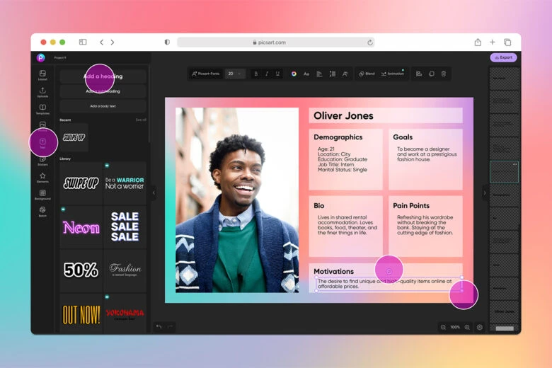 Ready to create your own user persona template? Picsart creative tools make the process fun and easy. Here are some simple steps to guide your hand, but feel free to explore the tools in greater depth at your leisure, too.