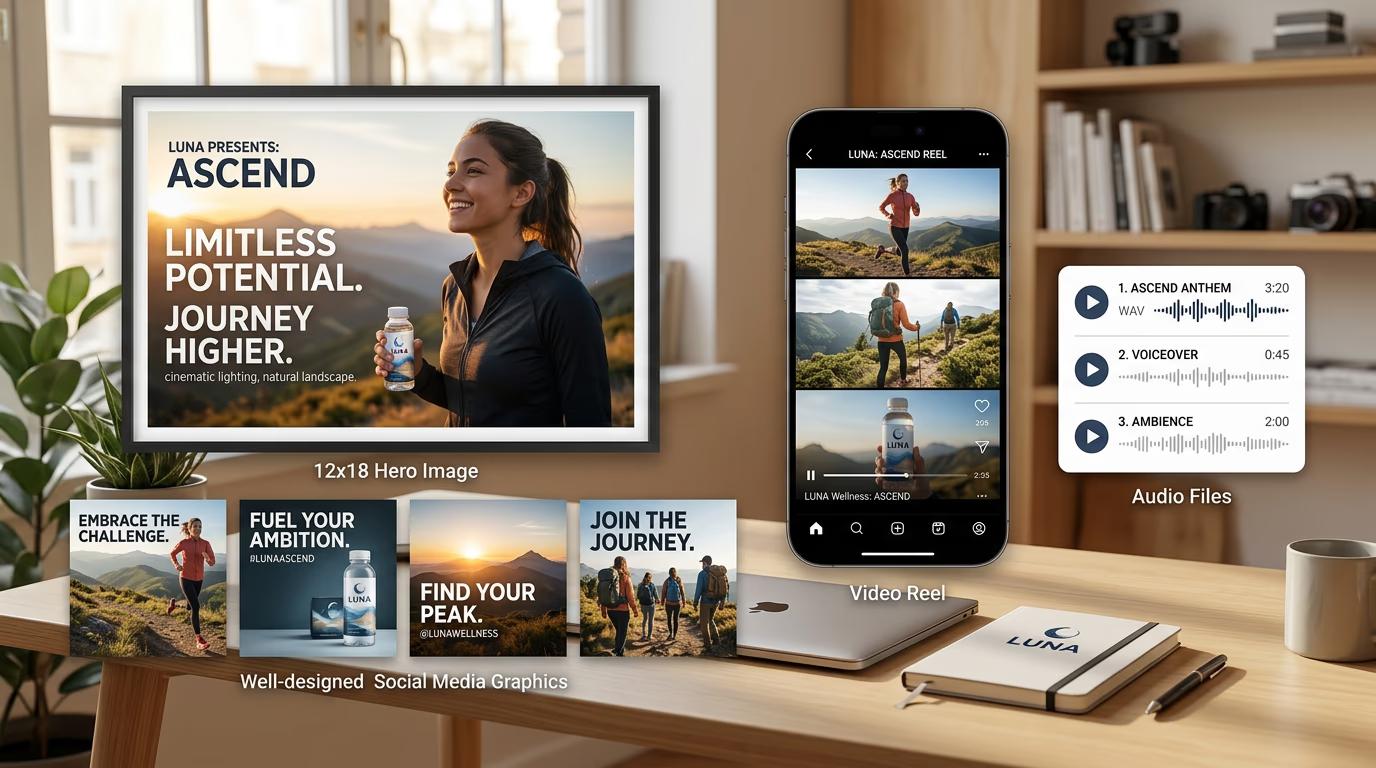 - Campaign kits: Hero image → social variants → video reel → soundtrack